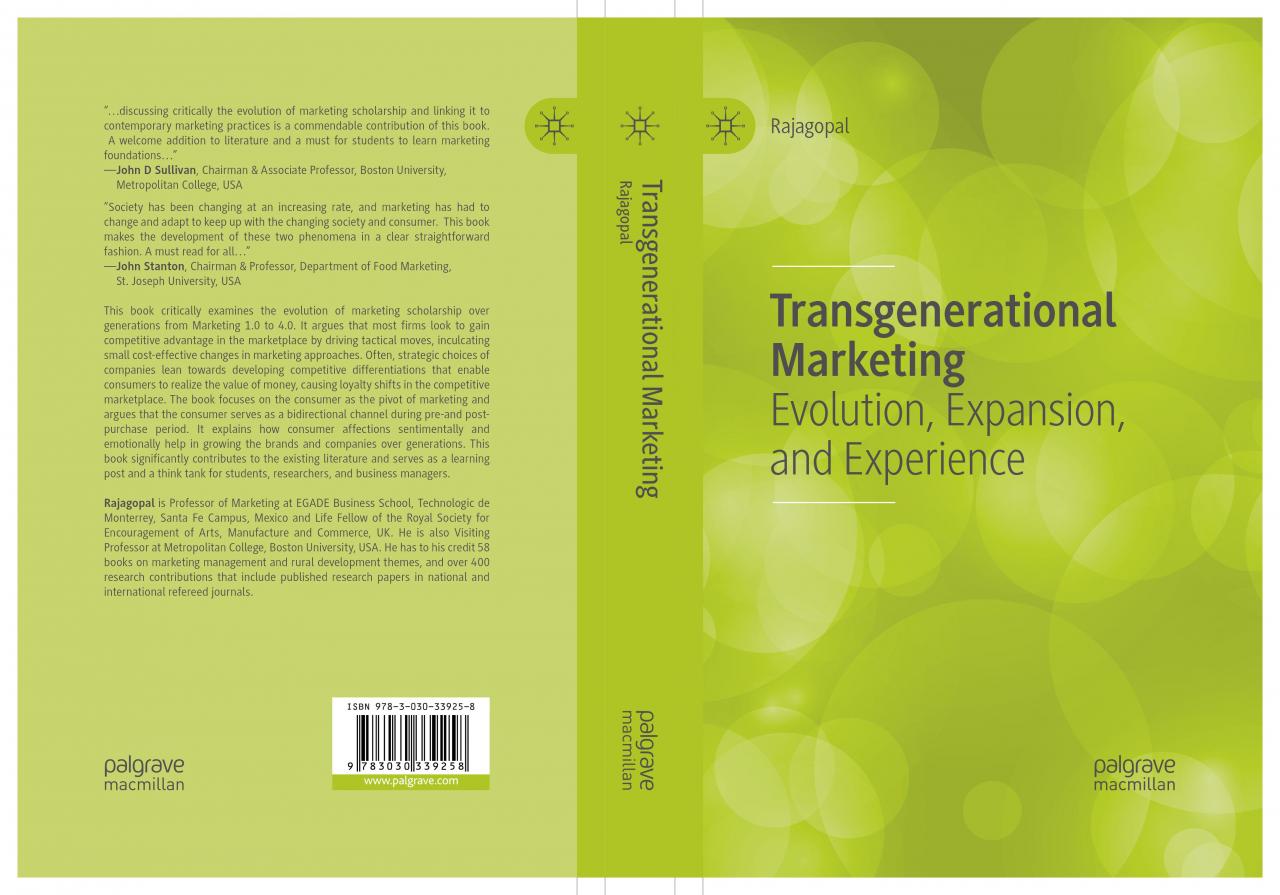 Rajagopal (2019), Transgenerational Marketing: Evolution, Expansion, and Experience, Palgrave Macmillan, New York. ISBN 978-3-030-33925-8